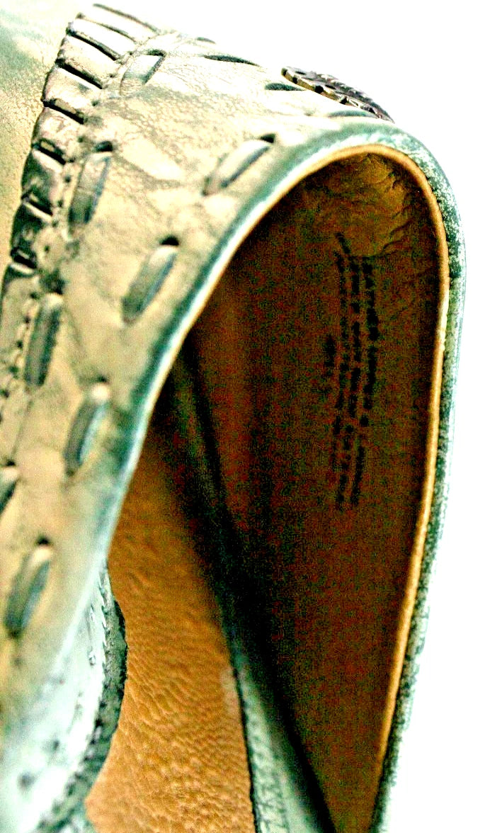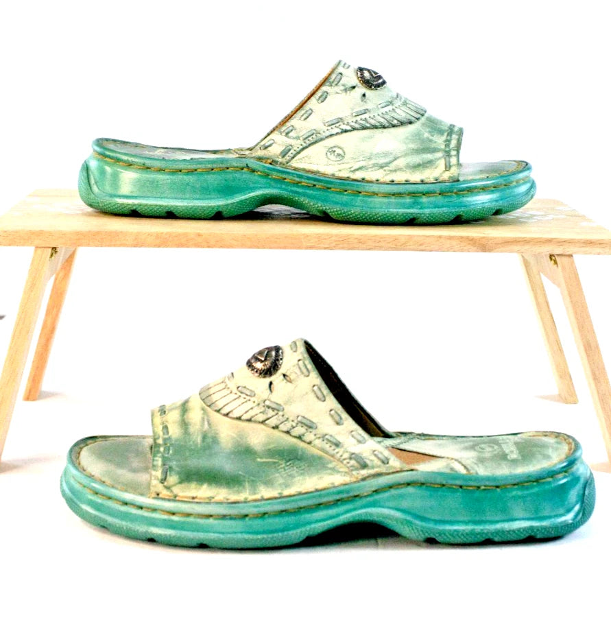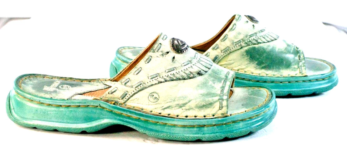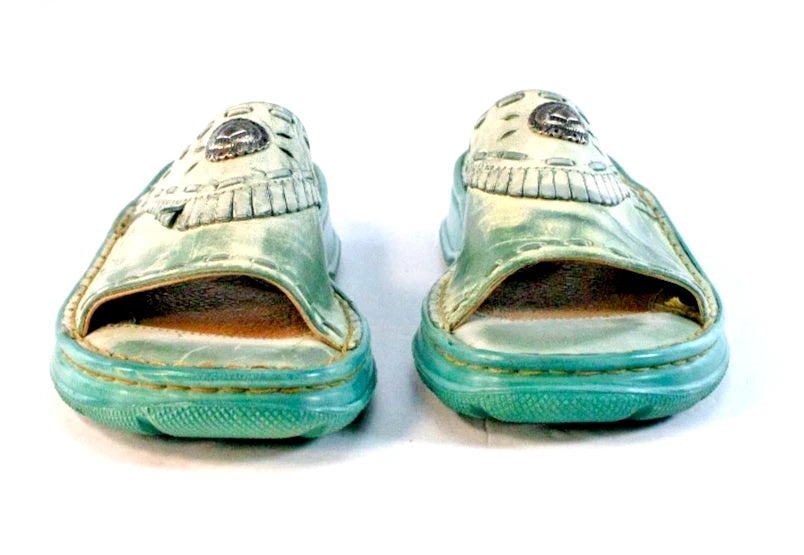Kick off your summer in these unique Double H Bods western-inspired slip-on sandals. Featuring a turquoise/teal leather upper with rustic whitewash patina, bold decorative stitching, and silver concho accents - they're equal parts comfort and cowgirl chic. With cushioned soles and rugged style, these are the kind of sandals that go from front porch lounging to festival walking without missing a beat.