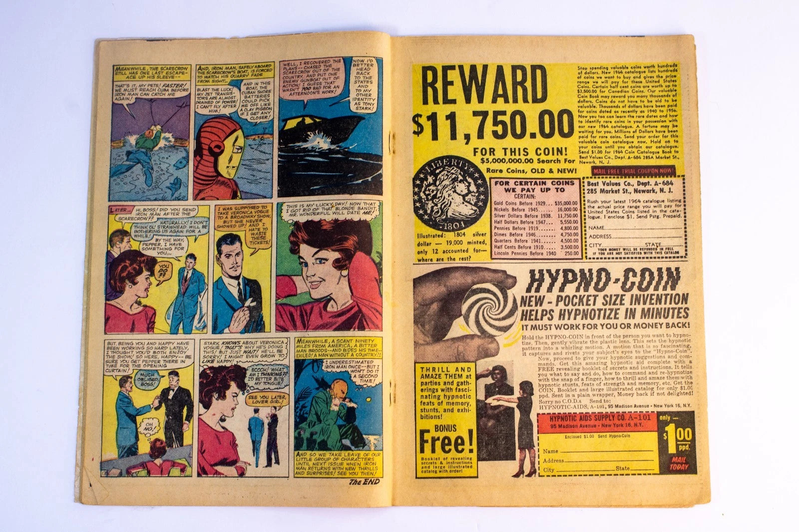 A collectible that captures Marvel's early Iron Man era - complete with iconic 1960s ads (Hypno-Coin, Dynaflex Bodybuilding, Mason Shoes, and more).