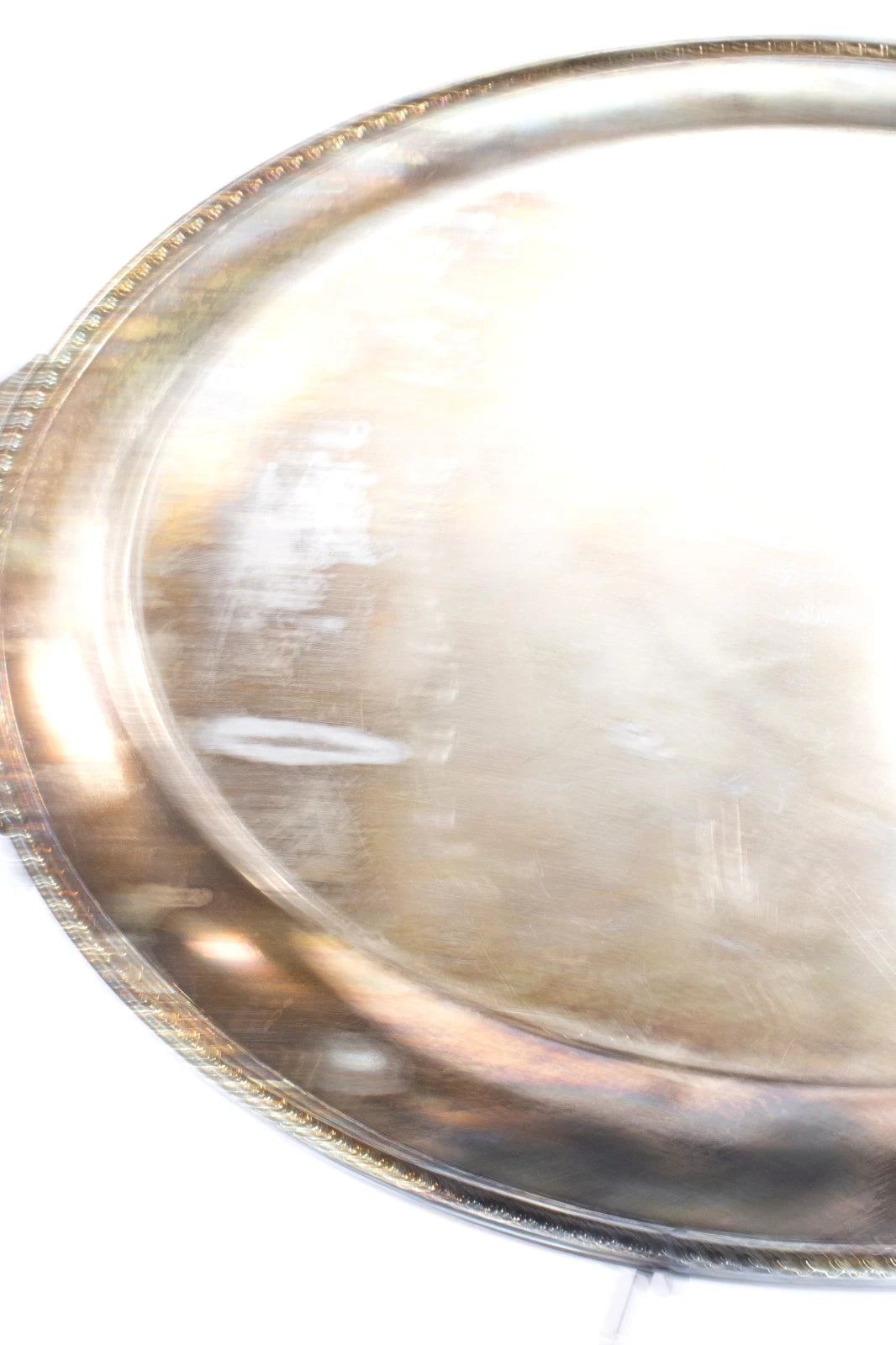 The oval tray features ornate edge beading, twin side handles, and light floral scroll engraving across the surface. Its tarnish has deepened into a warm rainbow patina that collectors of old corporate Americana will appreciate.