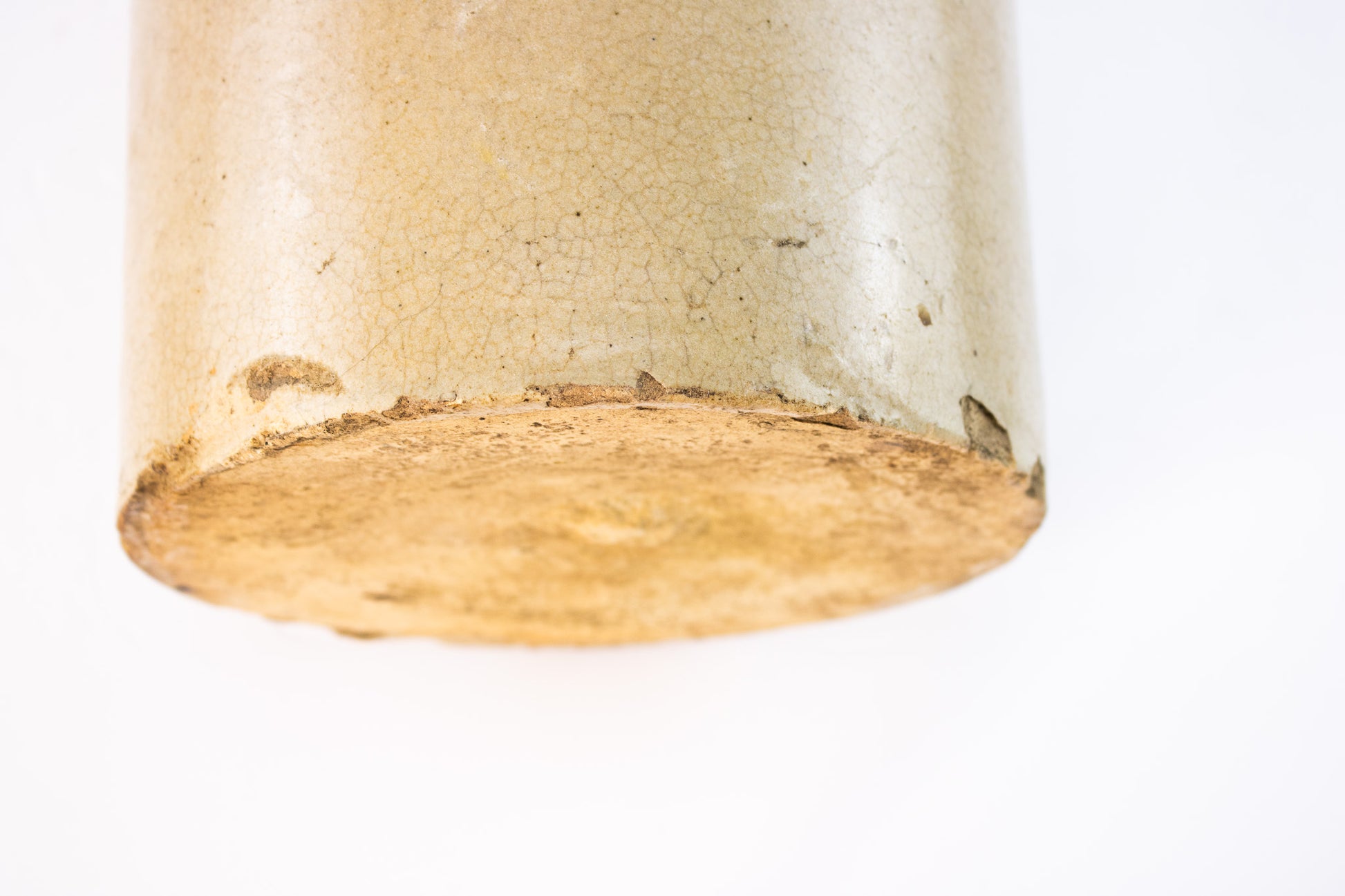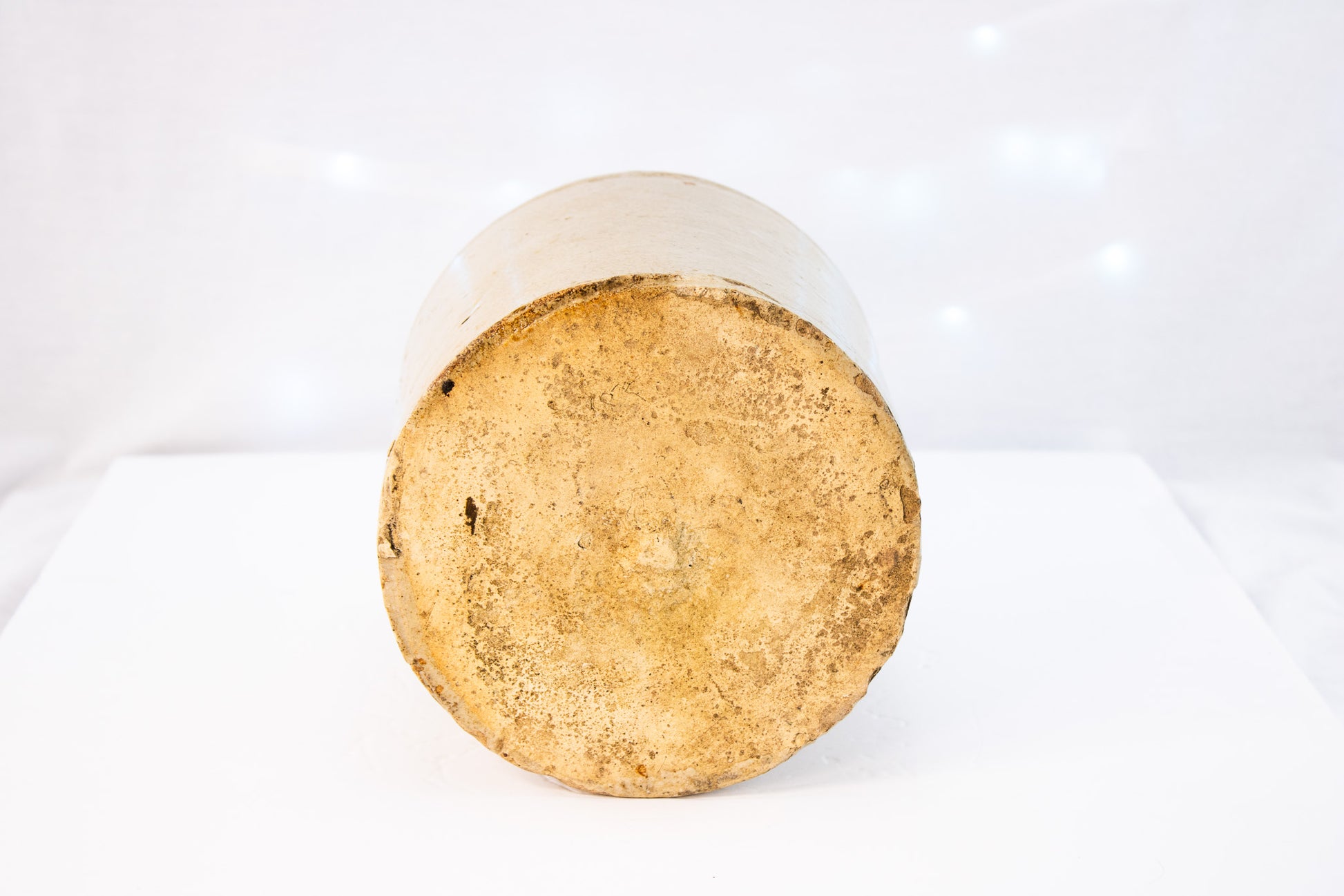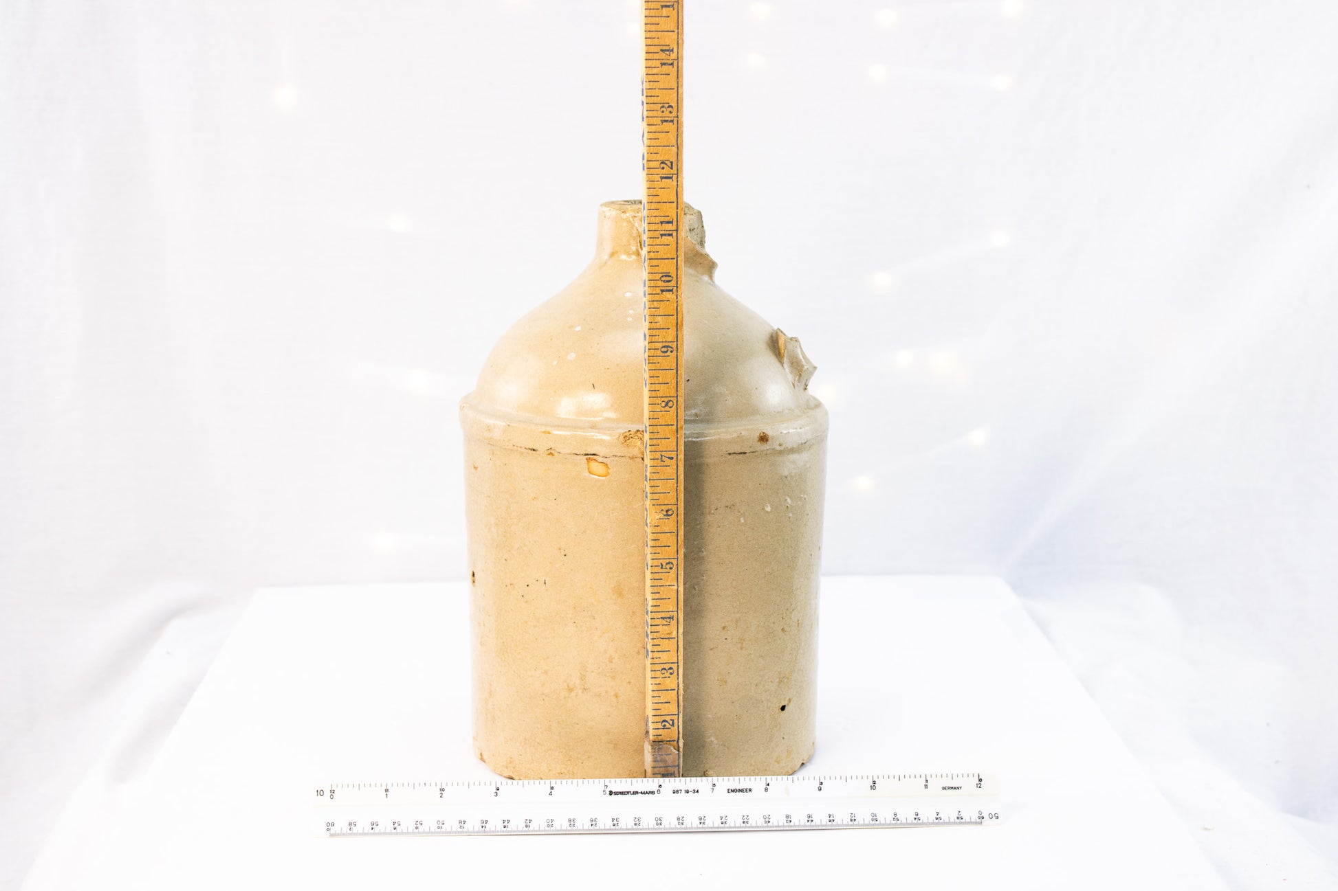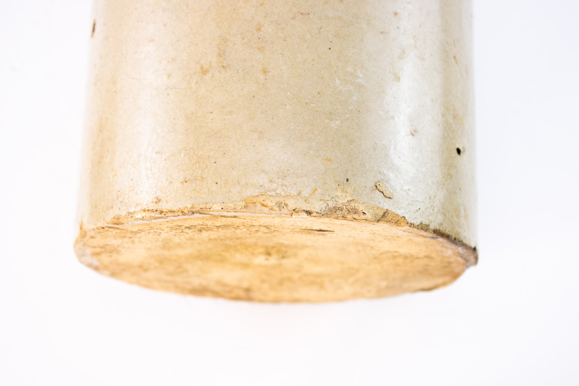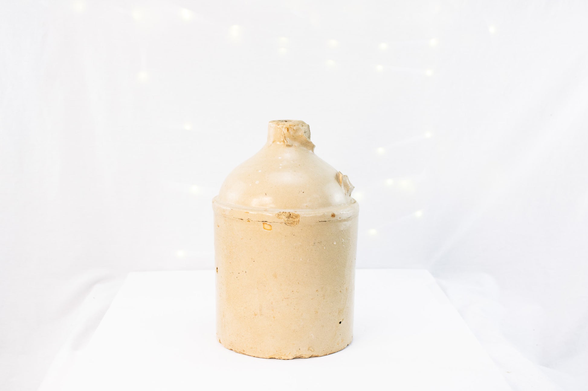 This antique stoneware jug carries the quiet confidence of true utility pottery-thick walls, warm cream glaze, and a shape built for hard daily work. Likely dating to the late 1800s to early 1900s, this jug shows honest age with kiln freckles, glaze variation, and old chips that tell its long story. The classic cylindrical body and rounded shoulder give it that unmistakable primitive farmhouse presence collectors love. Whether styled alone, filled with dried stems, or anchored in a rustic vignette, this piece brings real history into the room. No maker's mark visible, but craftsmanship and weight clearly place it in the antique category.