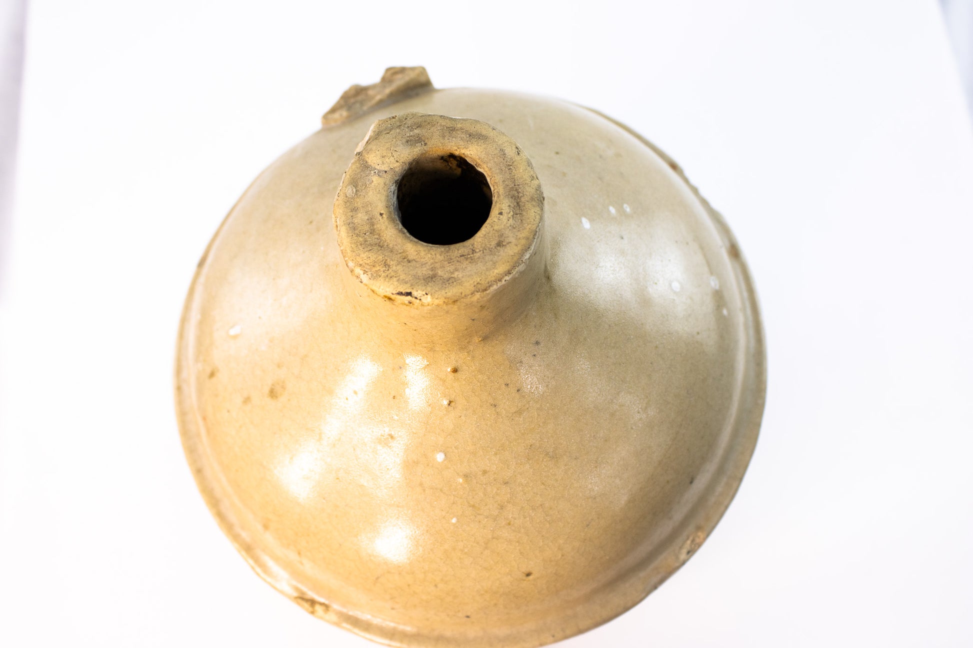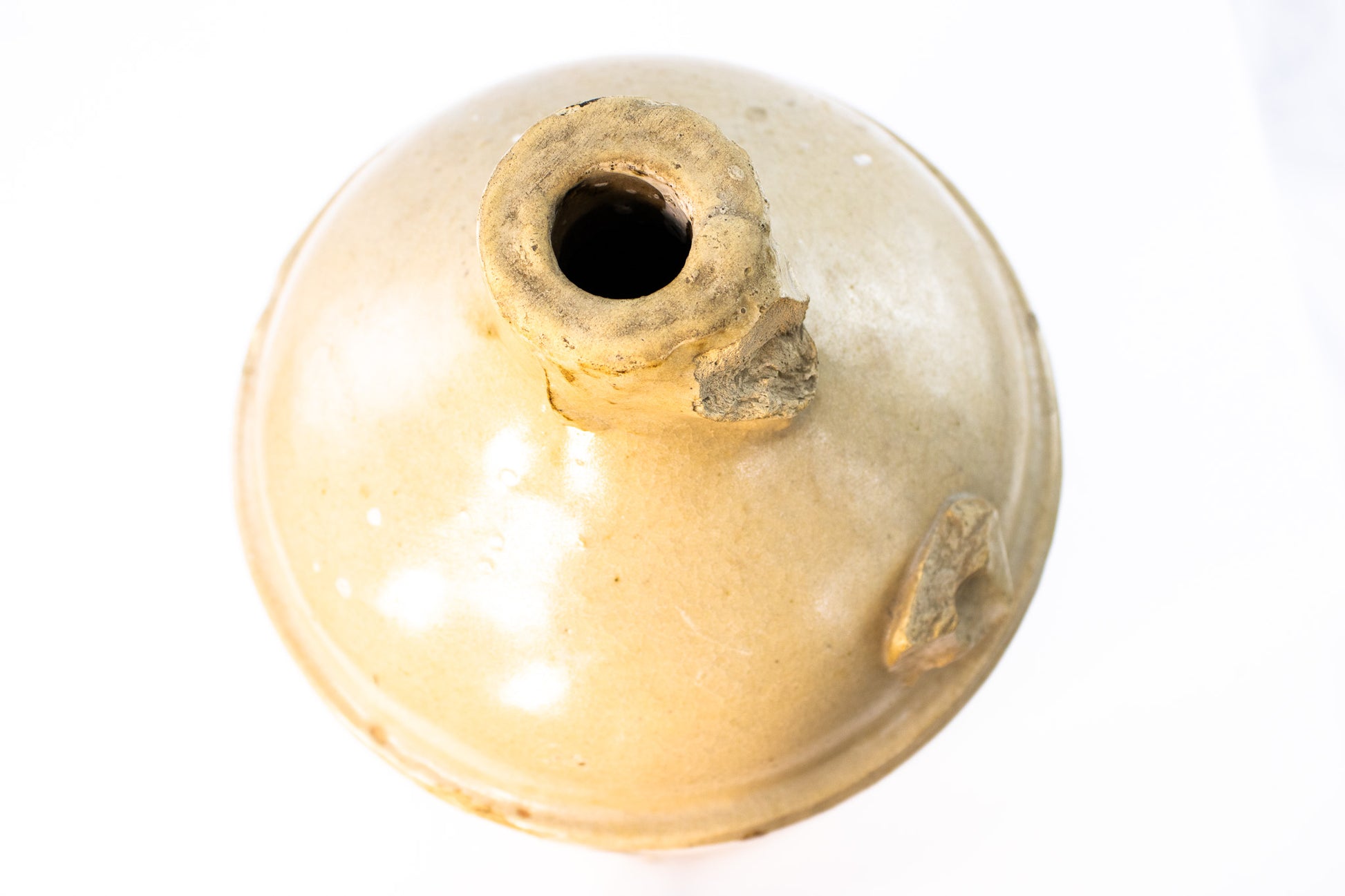 Authentic antique condition. Multiple chips to rim and shoulder, edge wear at base, glaze crazing, kiln freckles, and surface pitting consistent with age and use. No structural cracks detected. Stable and display-ready. Please review photos closely-they are part of the description.