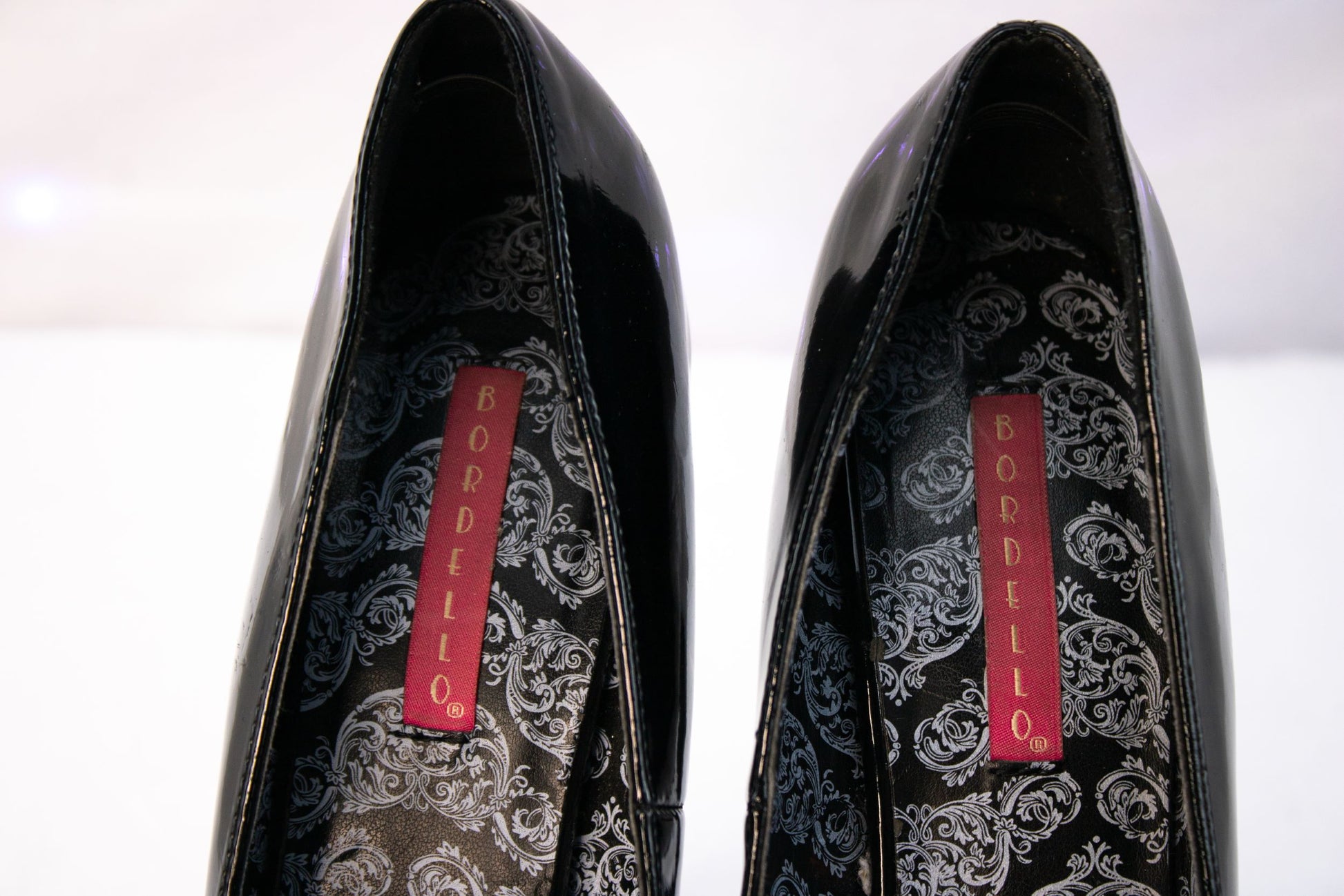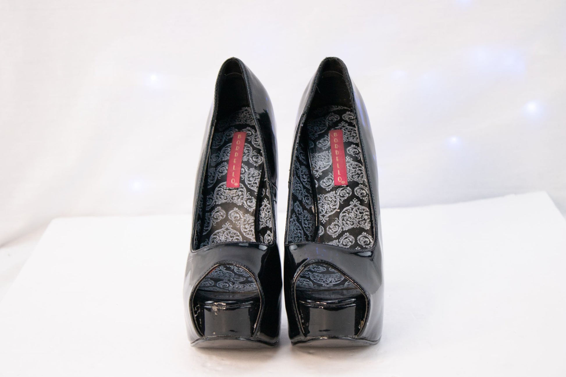 Turn heads and raise the bar with these bold Bordello platform heels in classic black patent. Designed for drama, these sky-high stilettos feature a glossy peep-toe silhouette, towering heel, and substantial platform that delivers both height and attitude. The sleek patent finish catches the light beautifully, while the patterned interior lining adds a subtle touch of flair only the wearer knows about. Whether styled for a night out, performance wear, or statement fashion moments, these heels bring unapologetic confidence to any outfit.