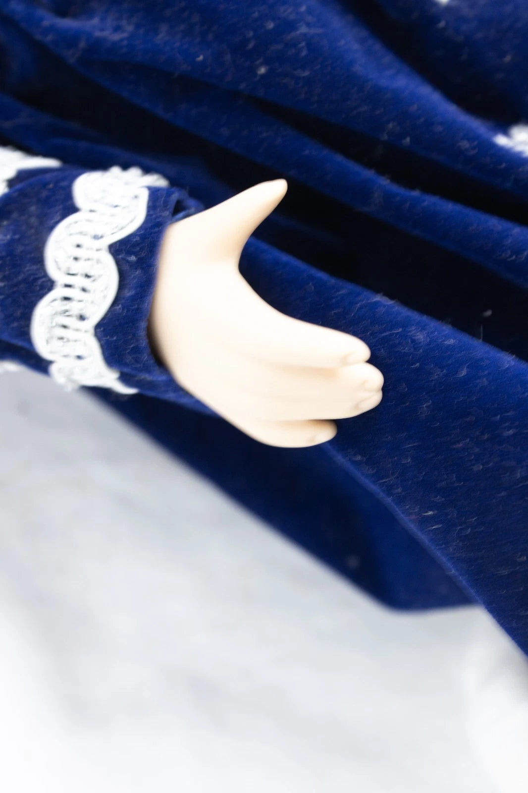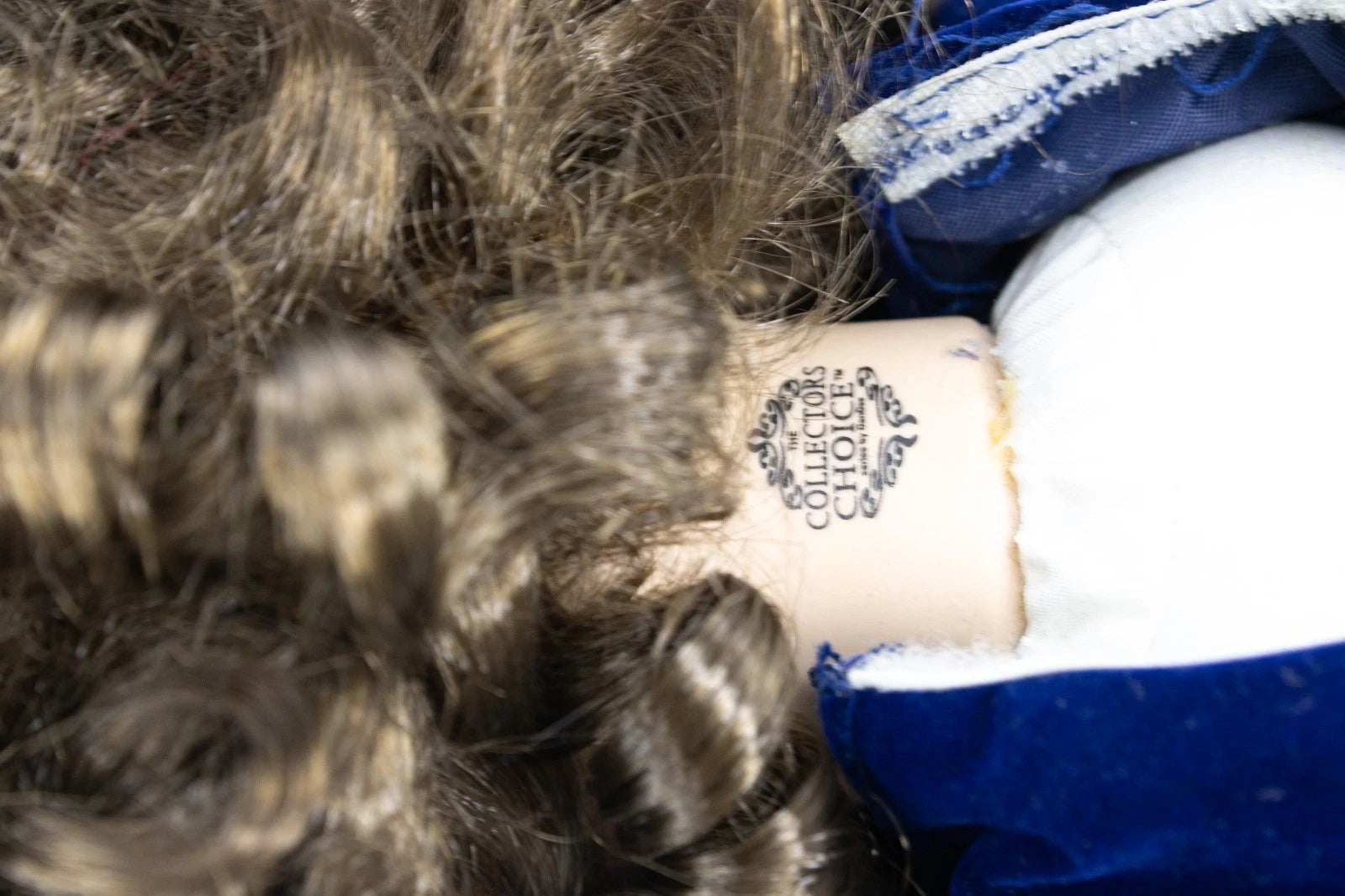 This Dan Dee Collector's Choice porcelain doll is ready for a snowy stroll, bundled in royal blue velvet trimmed with crisp white faux fur. Her look screams holiday elegance, right down to her matching muff and bonnet. She's approximately 18 inches tall and features: