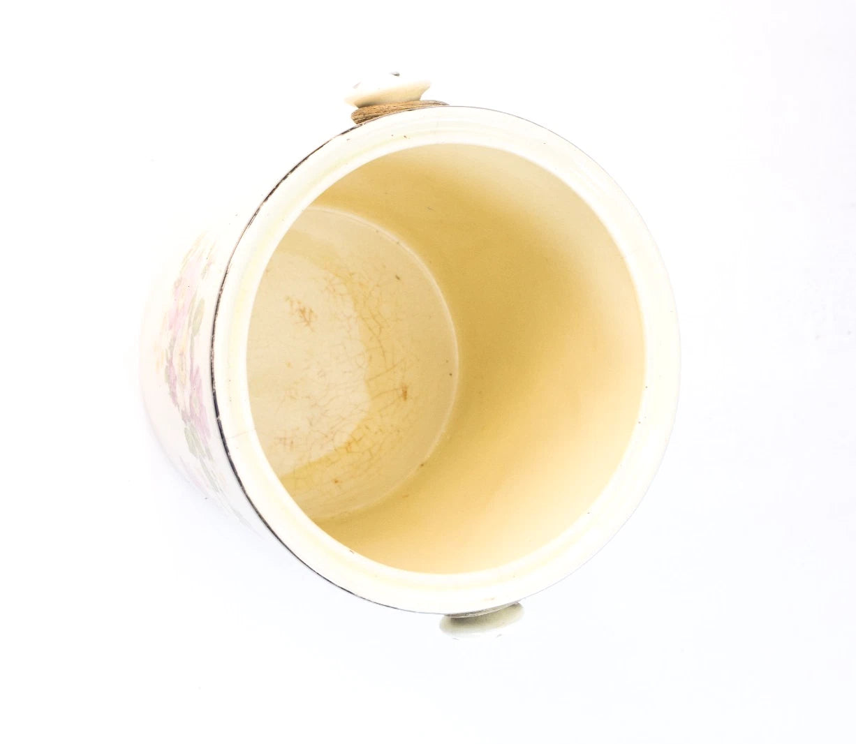 Subtle crazing and a fine age crack inside the glaze attest to its authentic vintage character. No chips, handle remains sturdy, and graphics are vibrant and glossy.