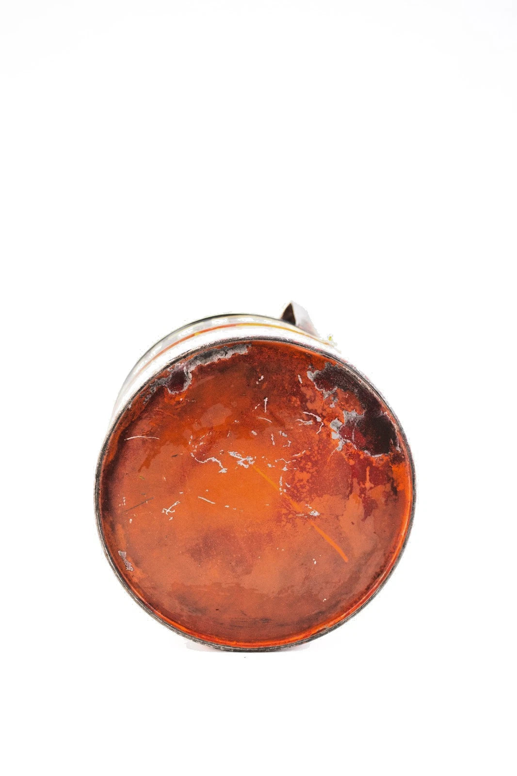 Condition: Fair vintage condition with visible surface wear, rust spotting, and paint loss. Hinge and spout intact and functional. Great industrial display piece - not recommended for modern fluid storage.