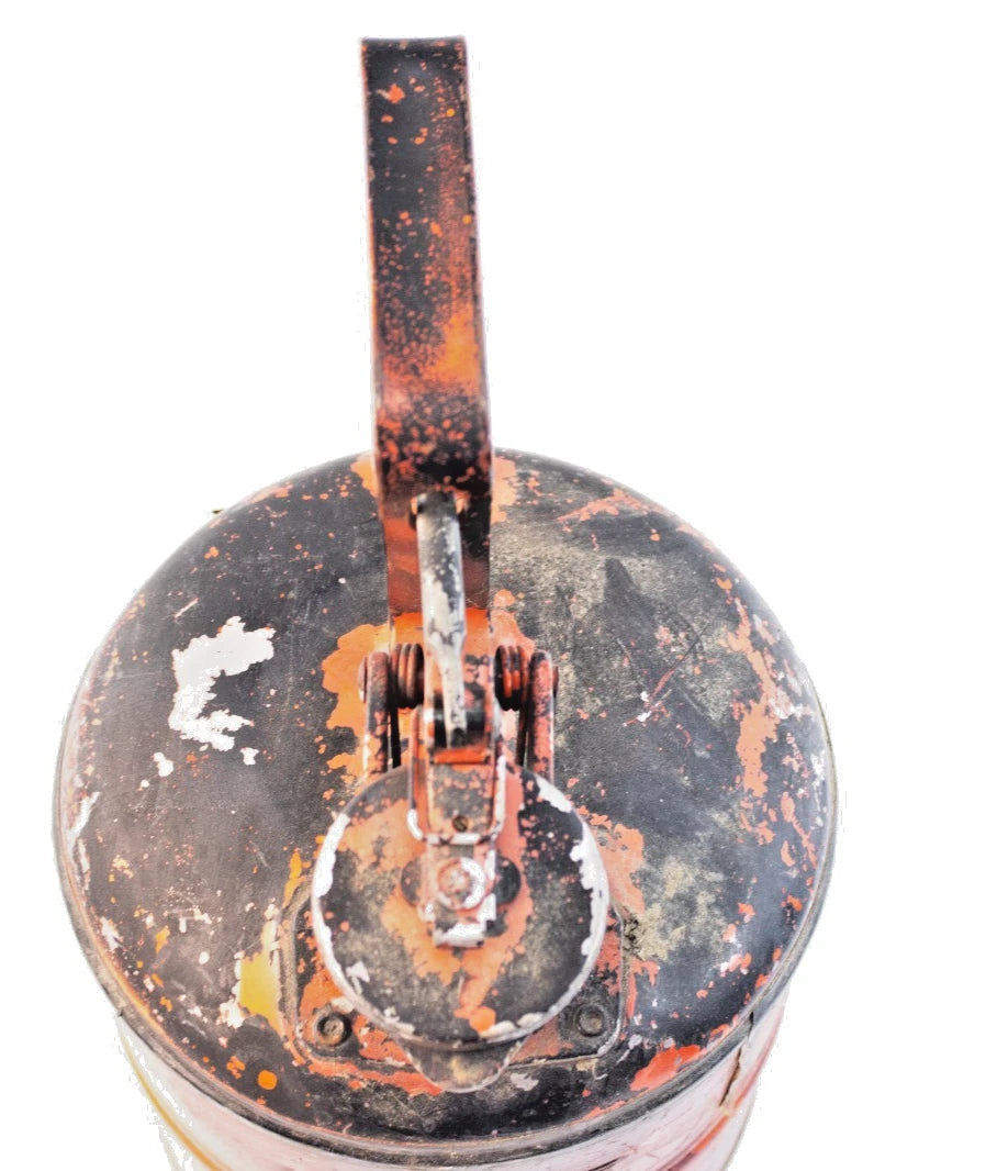 Painted in the original safety red and black, with a bright yellow CAUTION band that practically hollers "handle with care," this can wears its work scars like medals of honor. The lid and hinge mechanism remain intact, with satisfying industrial heft and patina.