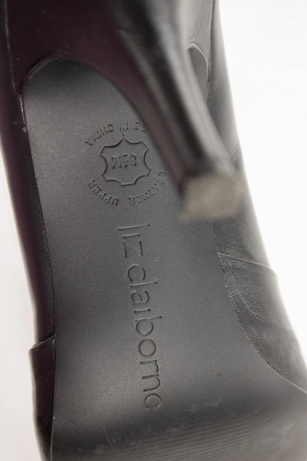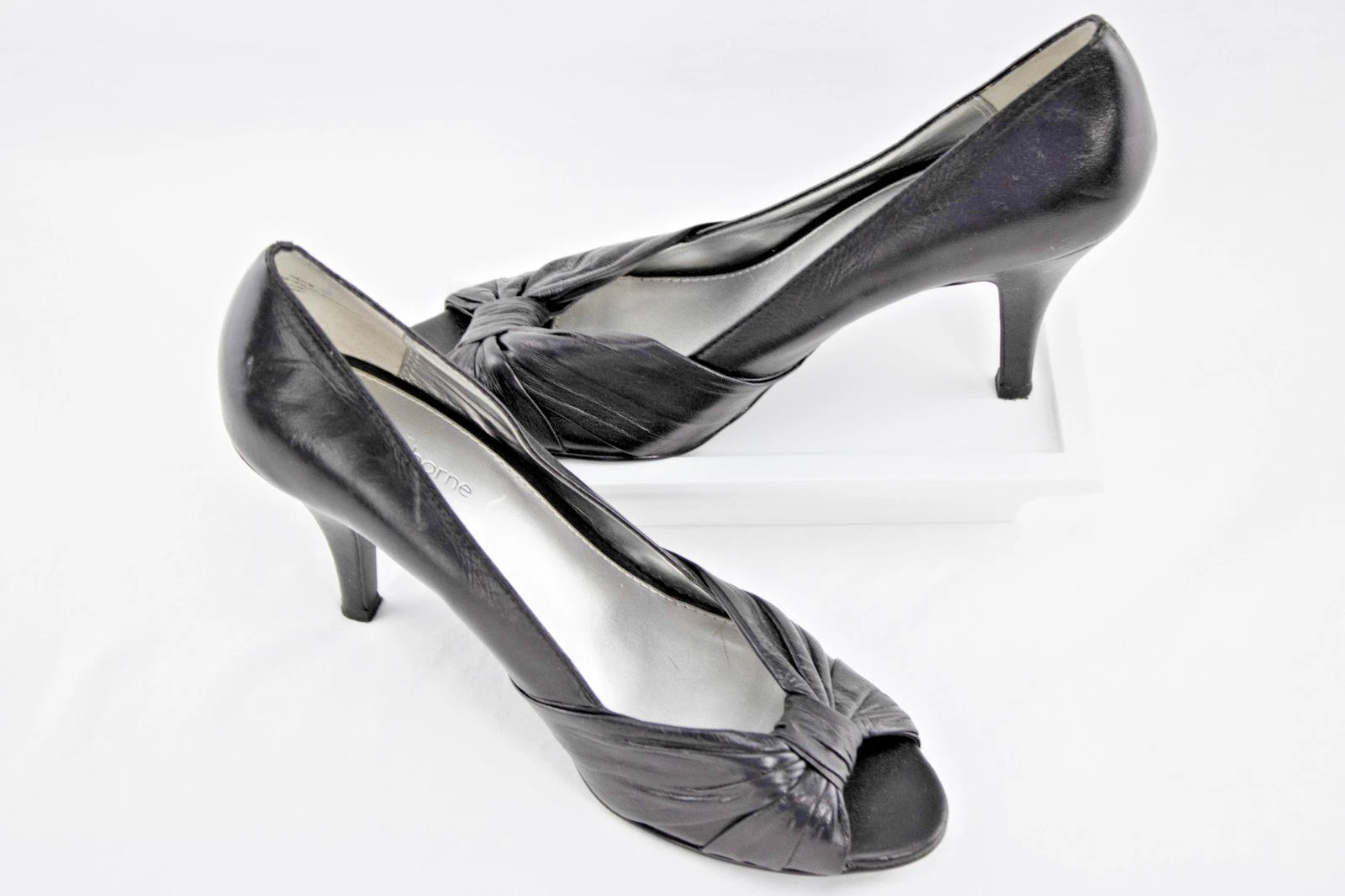 Slip into understated glam with these Liz Claiborne "Grace" heels - a refined black leather pump with a gathered knot detail that adds just the right touch of texture. The open-toe design and classic silhouette make this pair ideal for weddings, evening outings, or polished office attire. A graceful mid-height heel provides lift without sacrificing comfort.