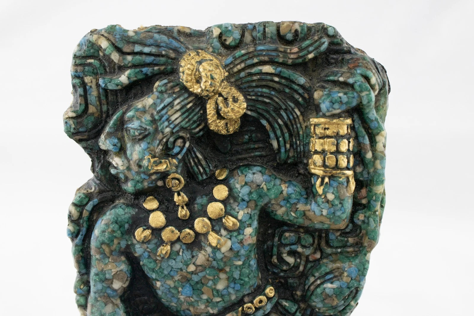 Mayan Mosaic Warrior Wall Plaque – Crushed Turquoise Stone & Gold Accents