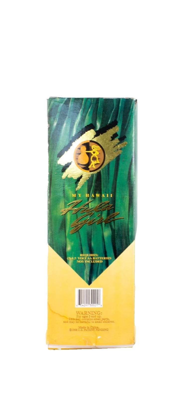 Doll appears in very good display condition - vibrant outfit, intact lei, no cracks or damage. Box shows visible shelf wear, edge scuffs, and light water spotting on one corner. Mechanism is untested (no batteries included). Sold as-is for collectible display.