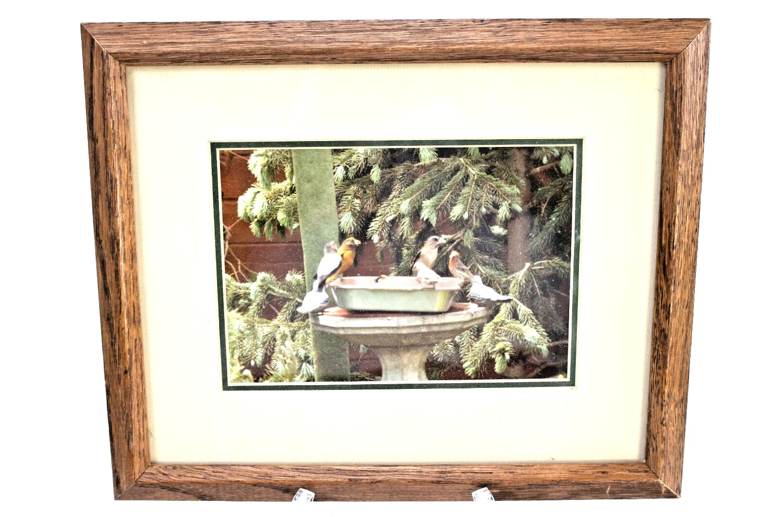 This is a unique set of two vintage garden birdbath photographs, each beautifully matted and framed in oak wood. The photographs feature a lively scene of various songbirds-finches, goldfinches, and sparrows-gathering at a birdbath nestled among pine trees and flowering shrubs. The natural setting is rich with texture and color, perfect for bird lovers and collectors of rustic or cottagecore decor.