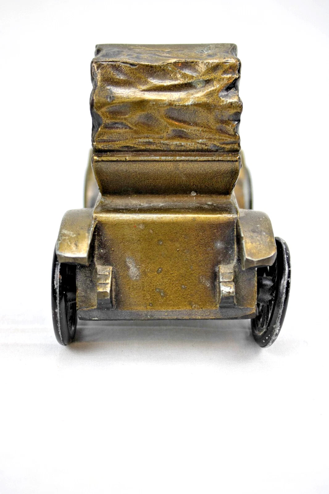 Each car is made of durable die-cast metal with rubber tires and working plastic coin slots on top. Bases feature removable coin stoppers (1 may be loose or missing). Paint and decals show wear consistent with age-ideal for display, restoration, or adding character to a vintage coin bank collection.
