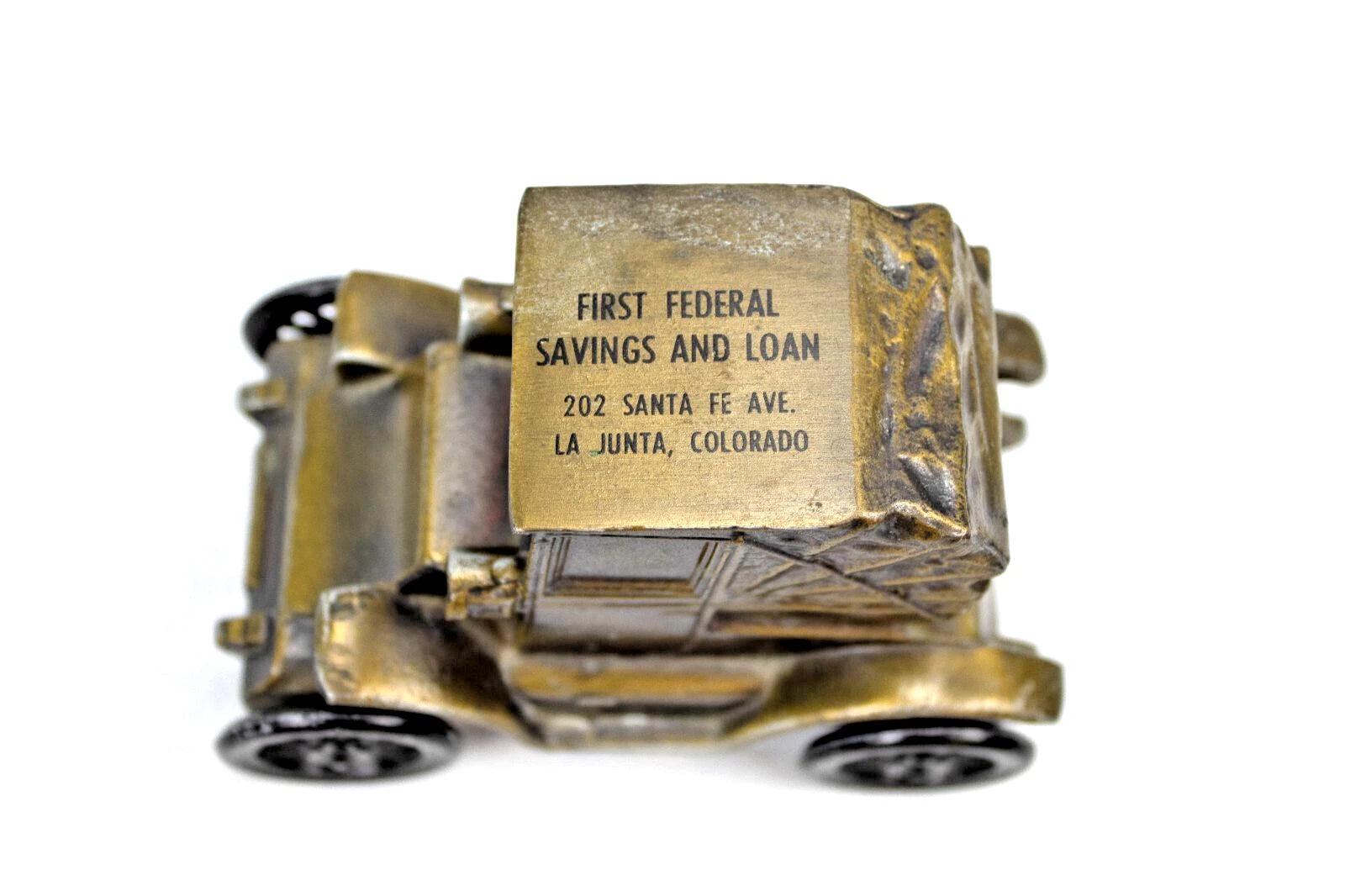 This 4-piece set of vintage metal coin banks is full of old-school charm and Americana flair. Each die-cast vehicle was part of a First Federal Savings & Loan promotional series, made to function as both a collectible and working coin bank.