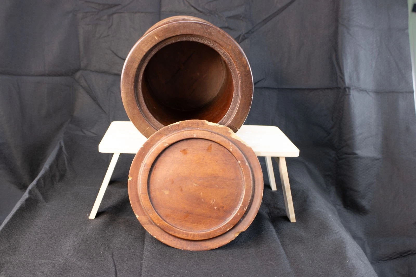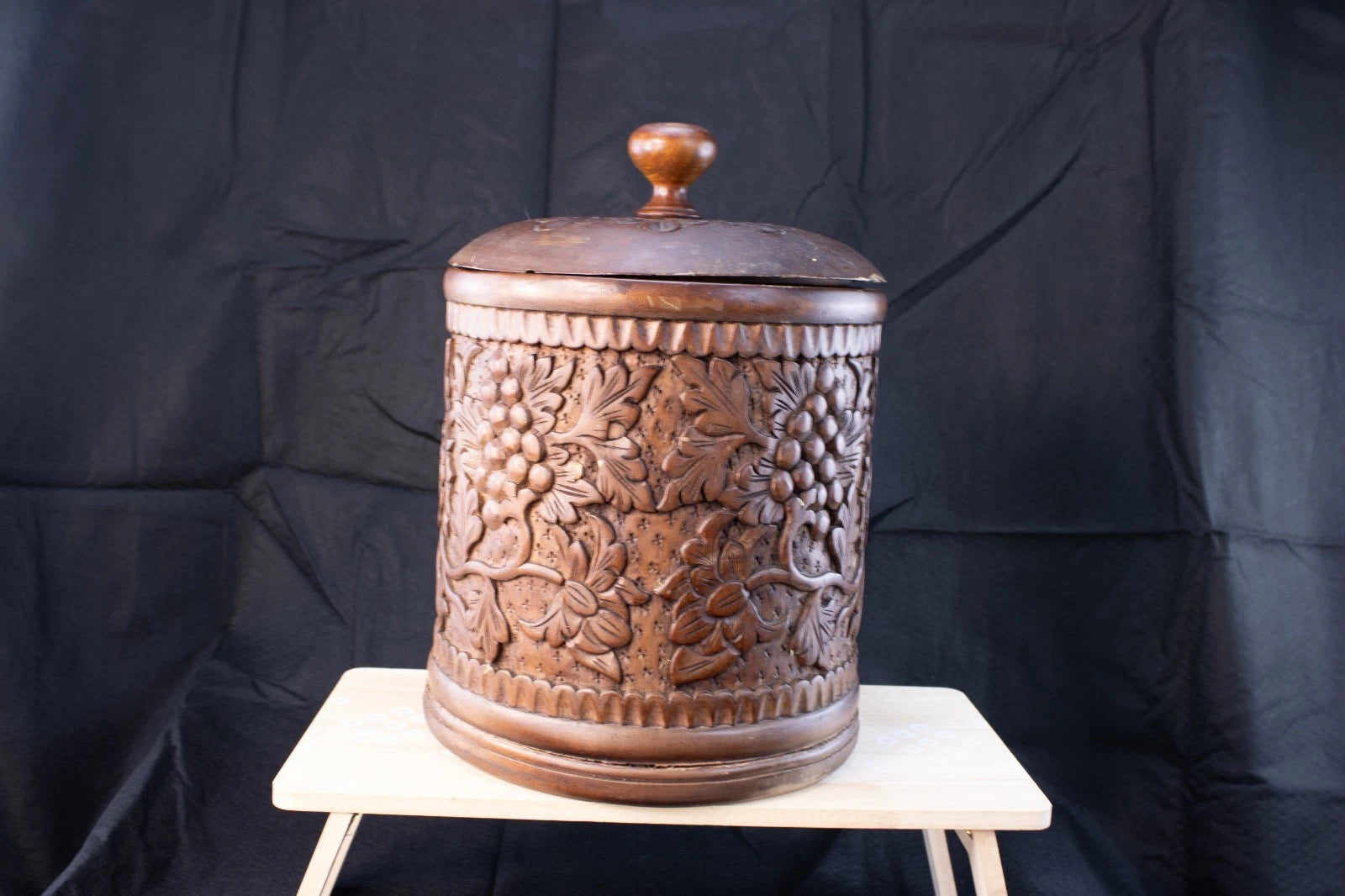 This handsome, one-of-a-kind wooden jar looks like it stepped right out of a craftsman's workshop in the 1950s. Every inch of it is hand-carved with vines, blossoms, and grape clusters that catch the light beautifully. The lid features a bold floral rosette and turned knob - the kind of old-world detailing that just doesn't come off a factory line anymore. Heavy, solid, and full of character, this jar feels right at home in any rustic kitchen, library, or cabin shelf.