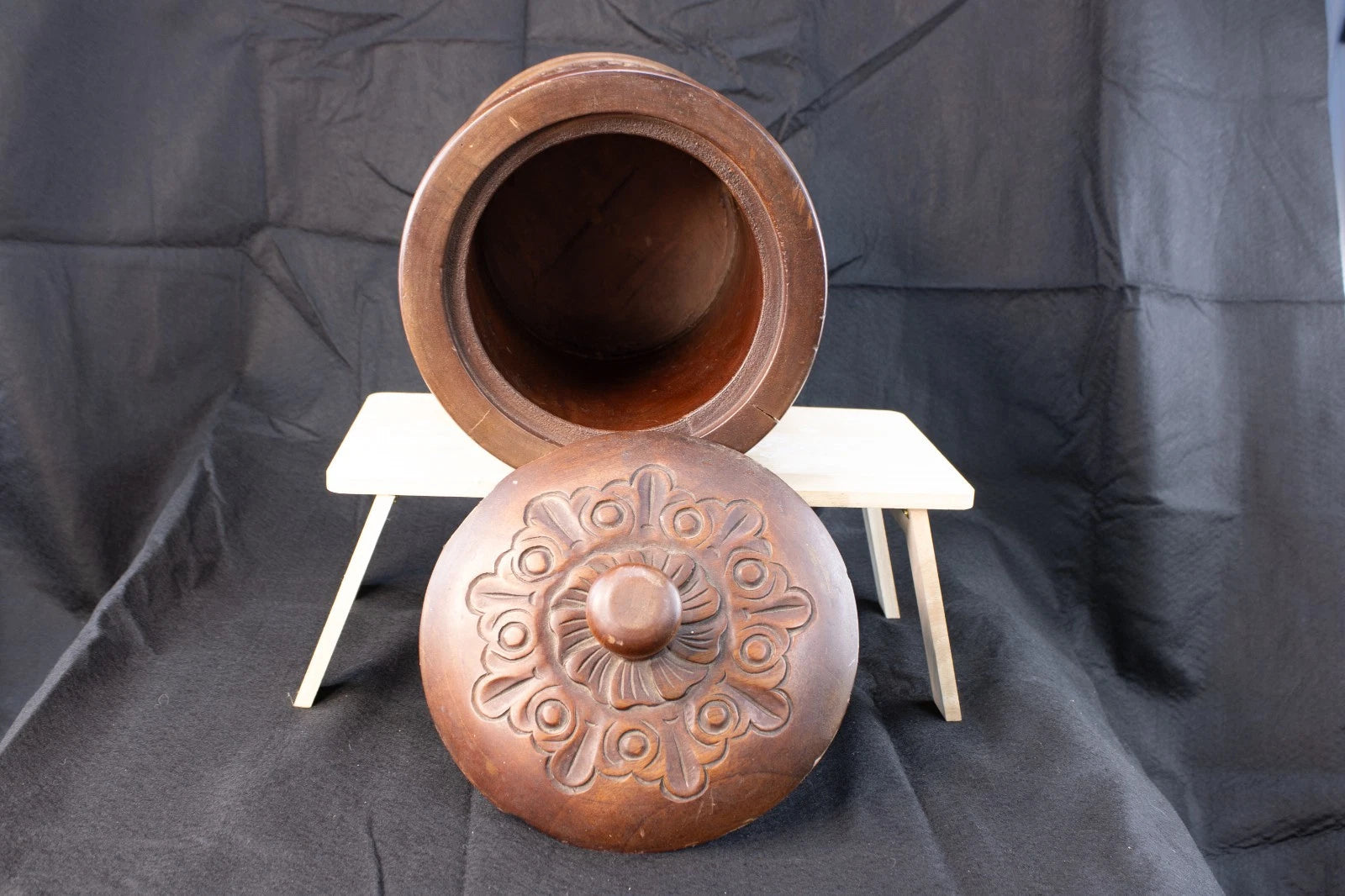 Vintage Hand-Carved Hardwood Floral Jar w/Lid Rustic Artistry from the Old World