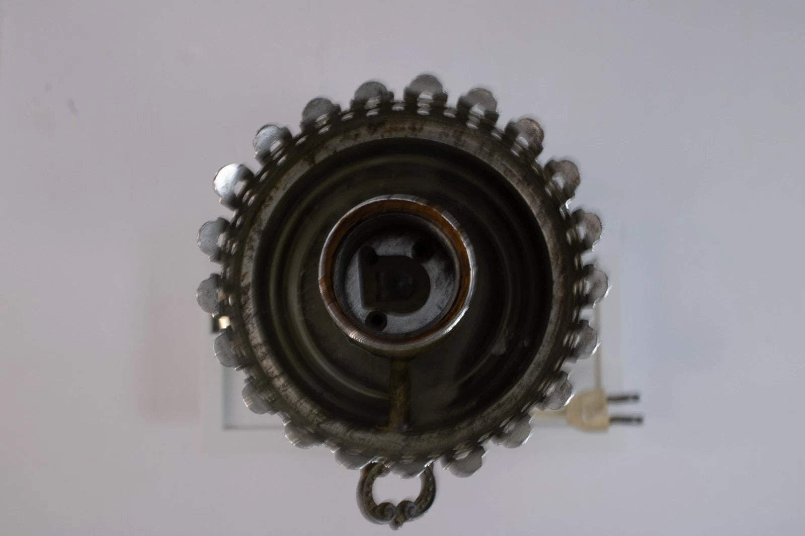 If elegance had a switch, this lamp would flip it. A classic mid-century electric table lamp base built in the style of an old-world oil lamp, with a gleaming brass body, polished wood stem, and a silver crown shade holder. Perfect for restoration projects or as a display piece for collectors who appreciate a little retro spark. Light works (tested).
