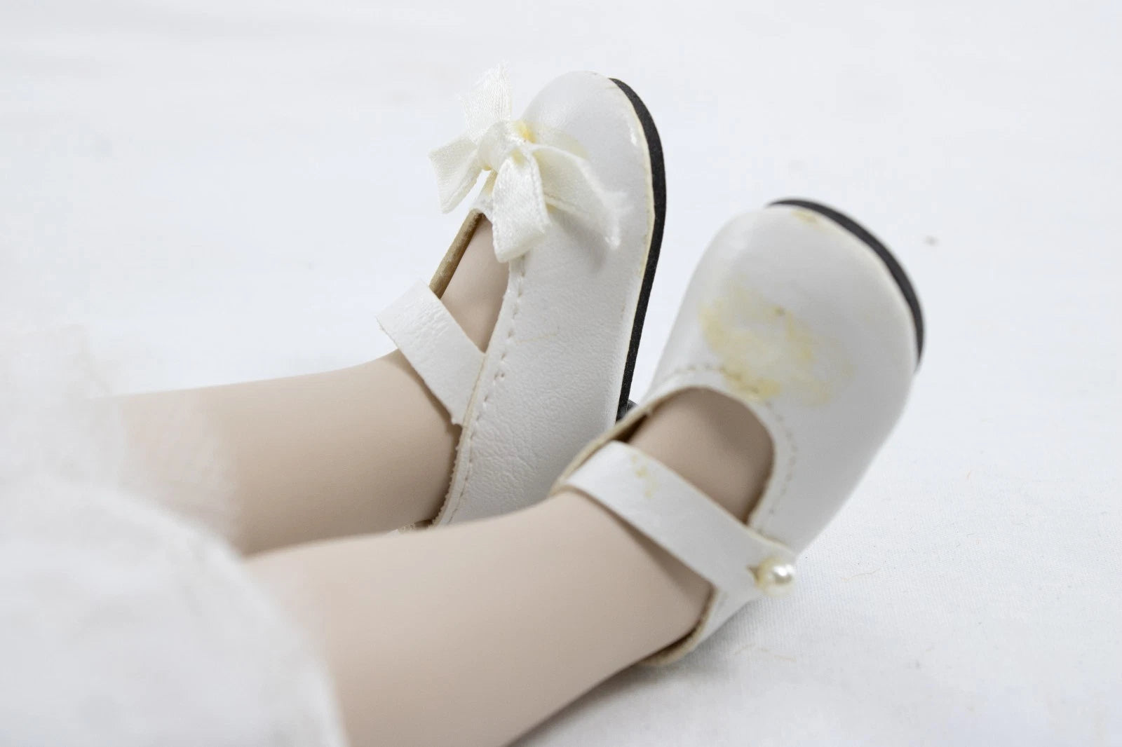 Gently pre-owned. Some yellowing to shoes and minor marks on one hand (see close-ups). Dress and veil are bright and intact. Hair may need light styling. No box or COA included. Priced accordingly.