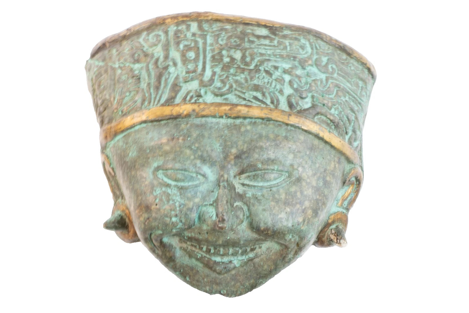 Vintage Verdigris Bronze-Finish Mask Sculpture – Ancient Style Smiling Face