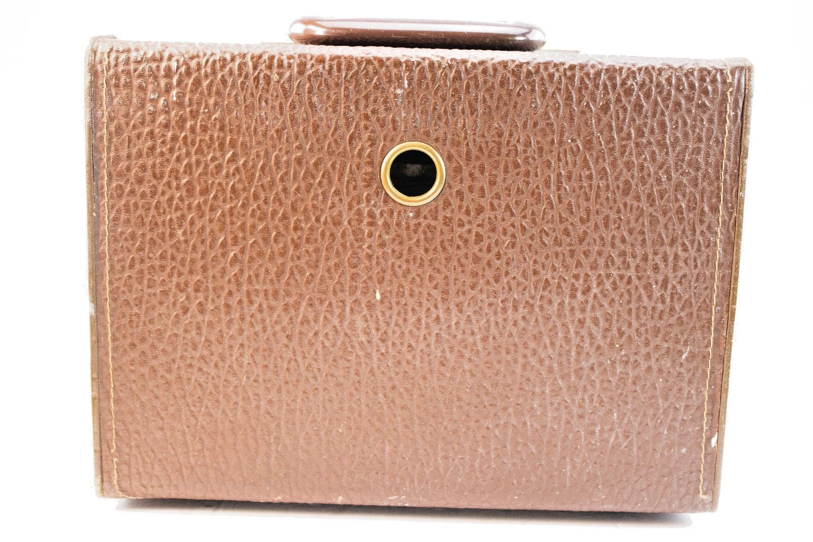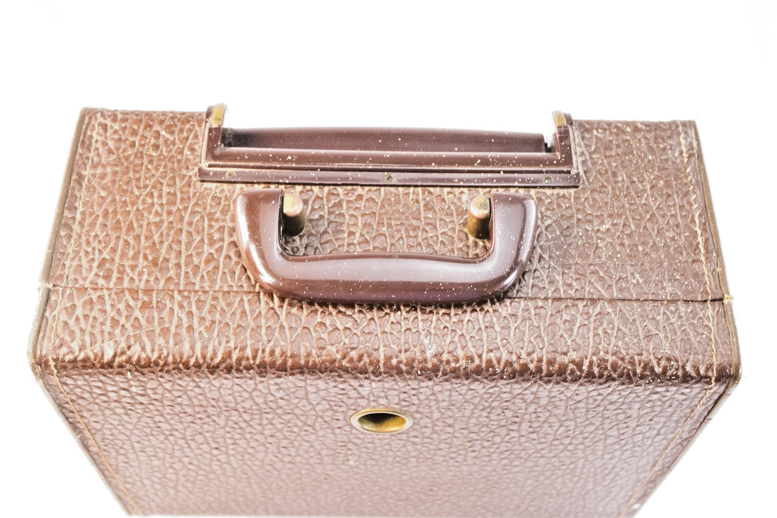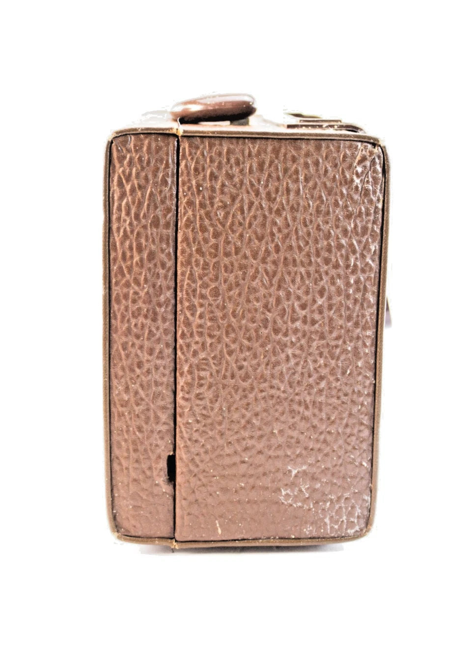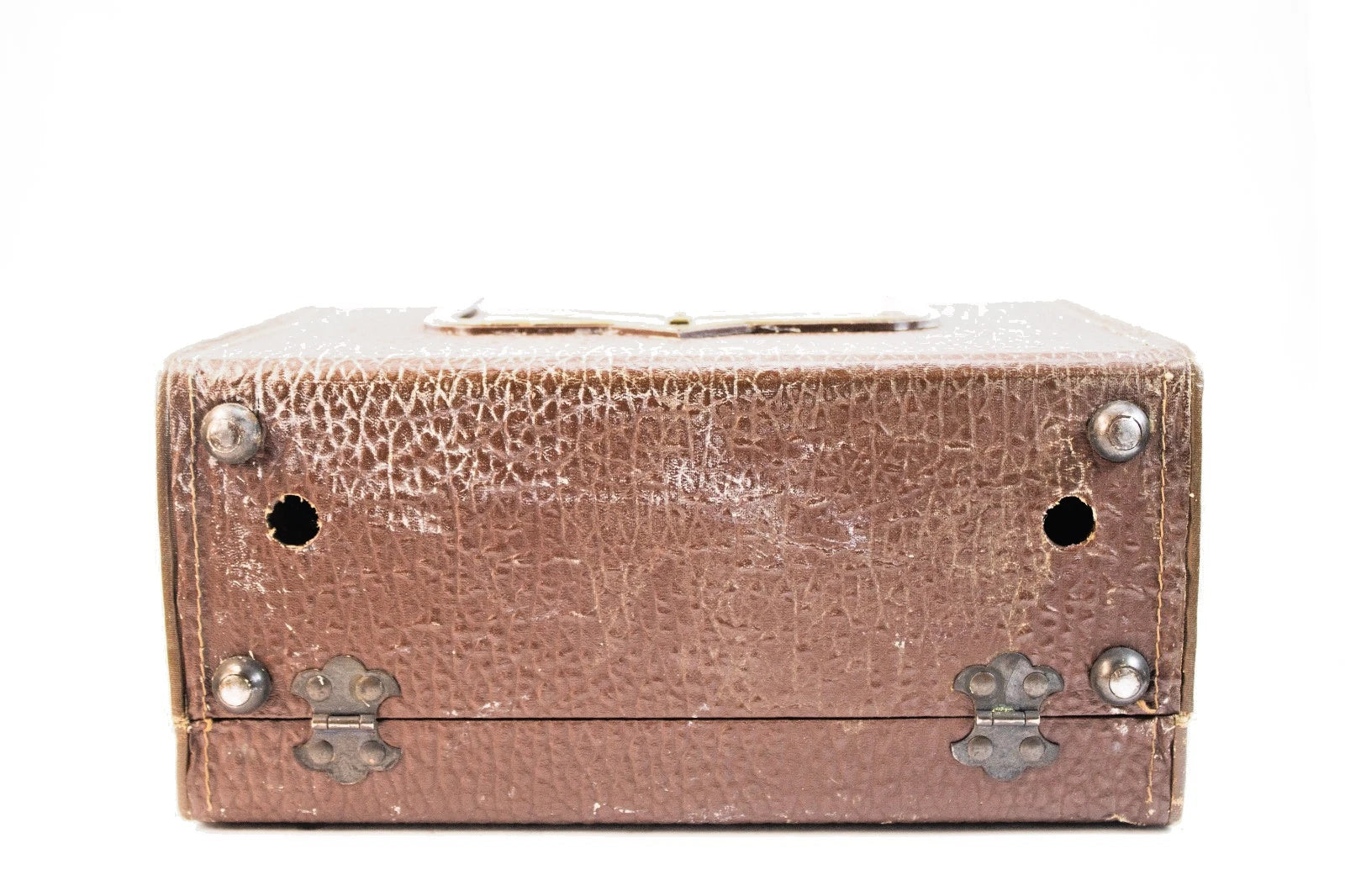 Materials: Leatherette-covered wood cabinet, brass-tone accents, bakelite handle